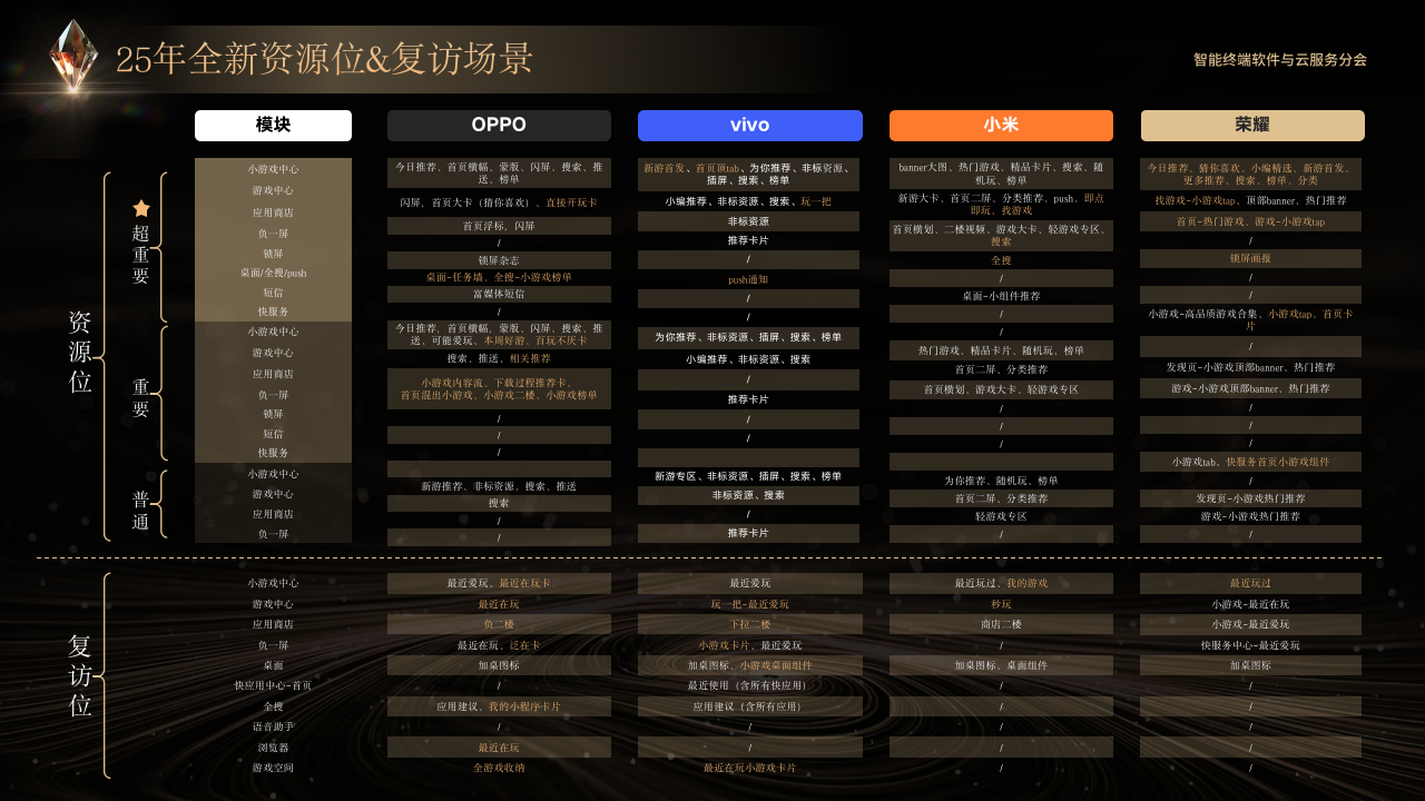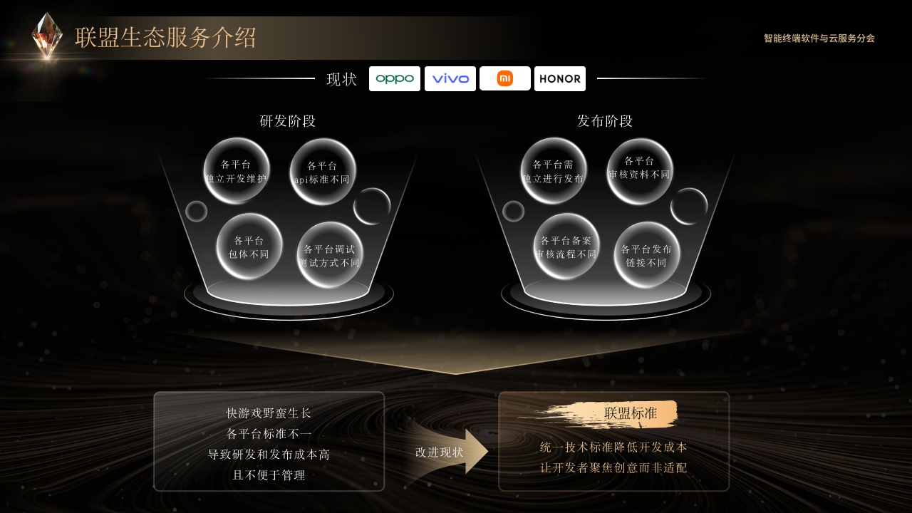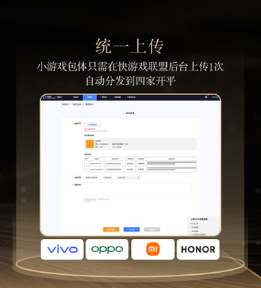 快游戏联盟联合 vivo、OPPO、小米、荣耀统一技术标准,解决传统快游戏多平台开发、发布、运营的碎片化难题:针对研发阶段各平台 API 标准、包体规范、调试测试方式不一,及发布阶段备案流程、审核资料、发布链路各异的痛点,实现四大厂商全流程标准统一,让开发者无需重复适配多平台,将精力聚焦于游戏玩法创新与内容打磨,真正达成 “一次开发,全平台高效分发” 的目标。