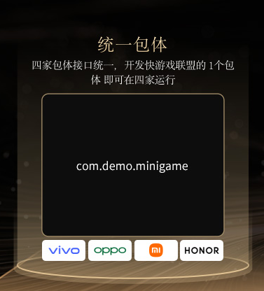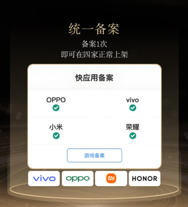 vivo、OPPO、小米、荣耀均已支持联盟统一包名.minigame后缀 ,开发者可通过快应用联盟官网统一备案、发布、分发上架;