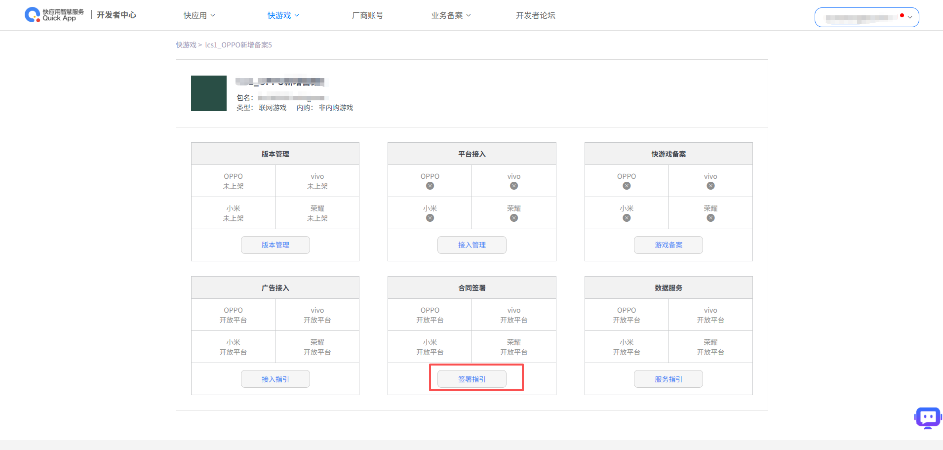2.5.1 快游戏创建成功可发起合同签署,目前联盟暂未对接入各家合同签署功能,暂时通过签署指引跳转各平台完成签署。