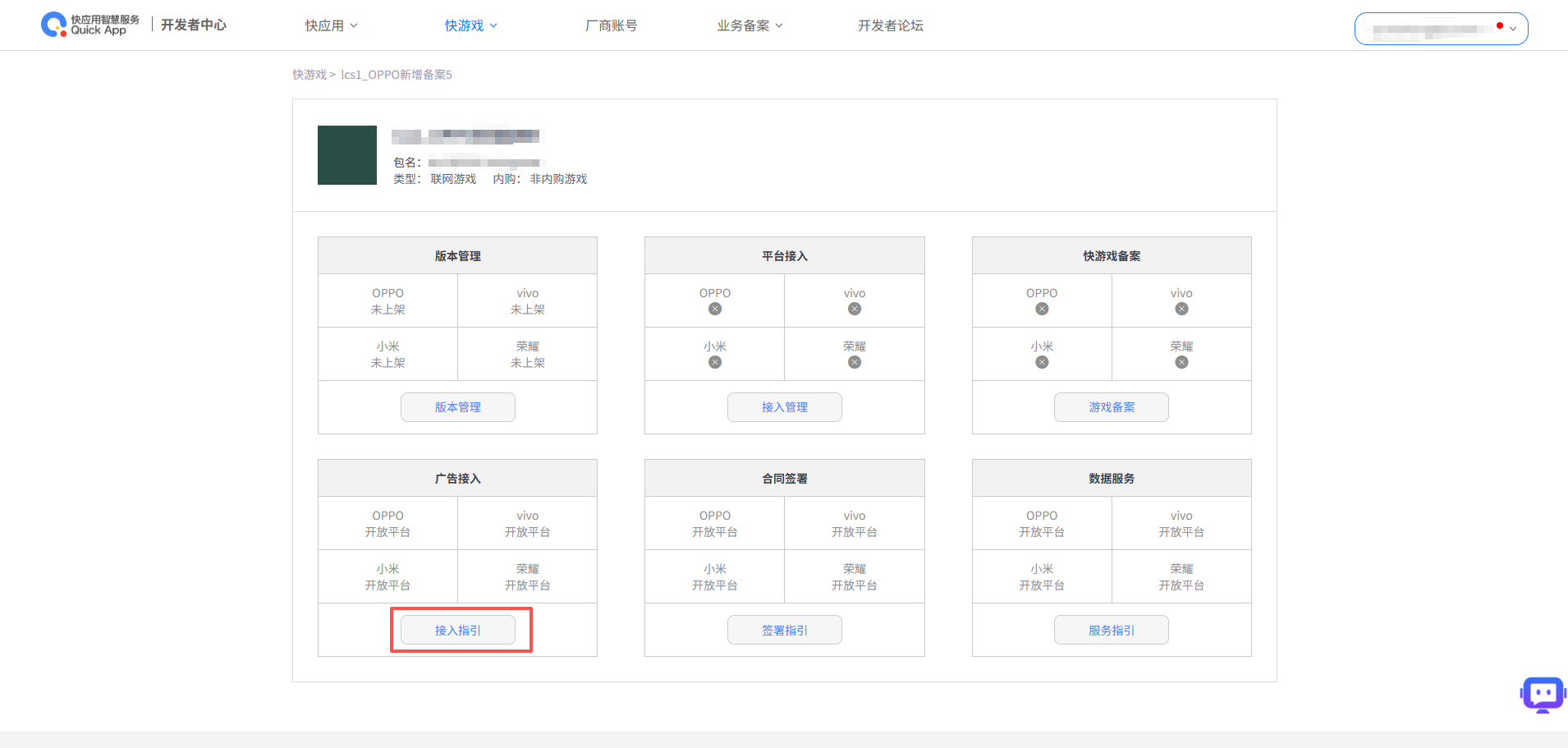 2.5.1 快游戏创建成功可发起广告接入,目前联盟暂未对接入各家广告接入功能,暂时通过广告接入指引跳转各平台完成广告接入。