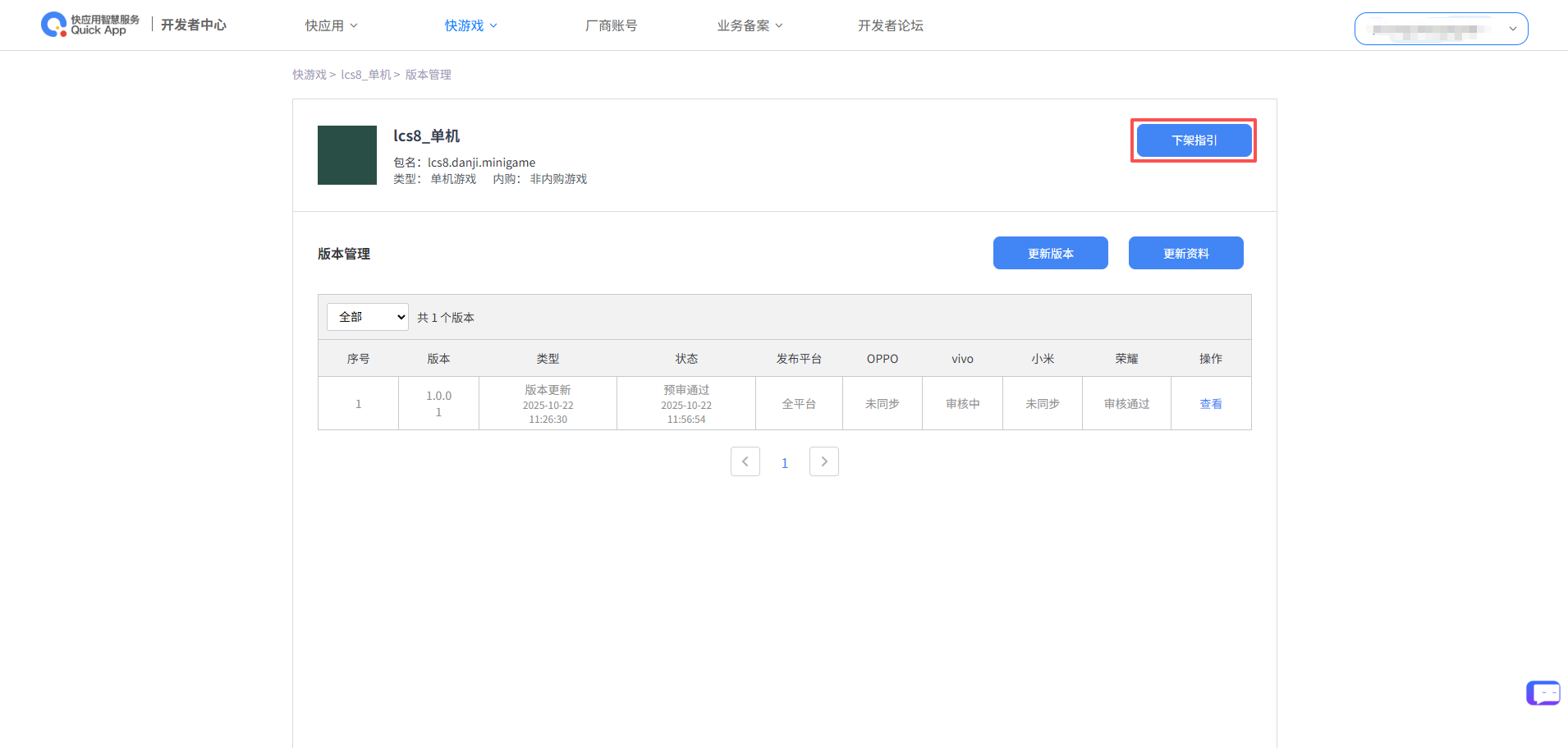 2.5.1 快游戏在厂商上架成功可发起下架,目前联盟暂未对接入各家下架功能,暂时通过下架指引跳转各平台完成下架。